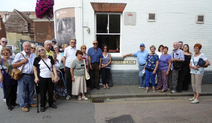 On Sunday 27th August, JTrails Director, Marcus Roberts, lead a group from Romford Synagogue, on a tour of the Jewish Trail of Canterbury, which included a visit to the historic restored cemetery, the sites of the 18th century and medieval synagogues, the medieval Jewry and to the 19th century Egyptian style synagogue. The group are pictured in 'Jewry Lane' close to the site of the medieval synagogue.